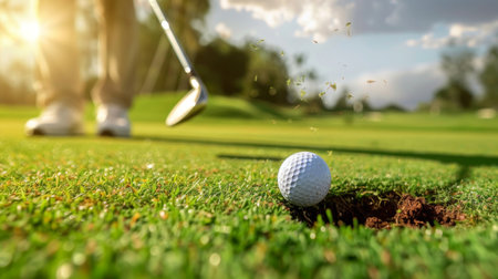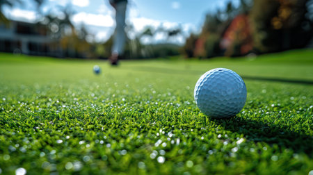 Golf ball sitting on top of a lush green golf course. Generative AI