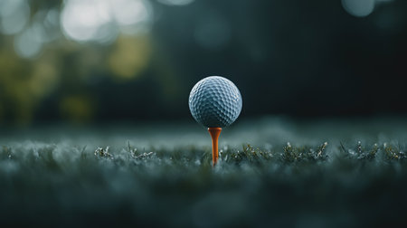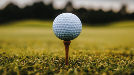 A stunning close-up of a golf ball placed on a wooden tee, showcasing the vibrant green grass of a golf course under soft evening light for a serene setting.