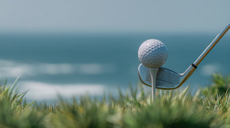 A close-up of a golf ball positioned on a tee with a golf club in the foreground. The serene coastline and ocean waves offer a stunning backdrop for sports activity.