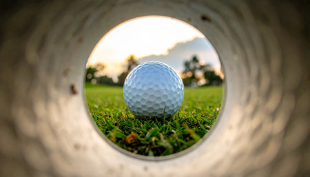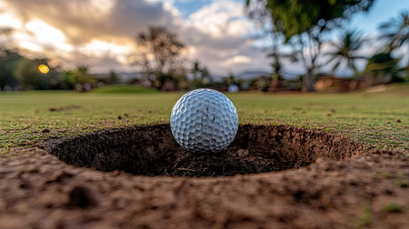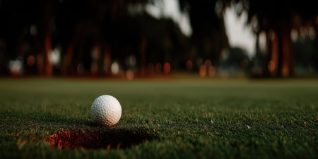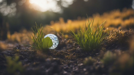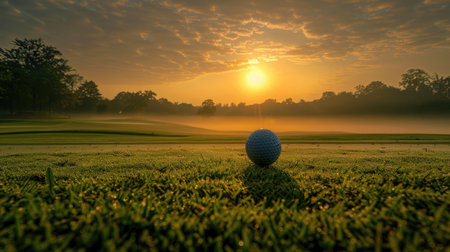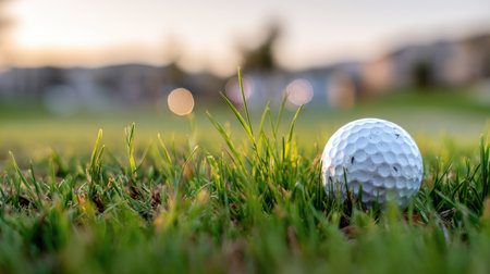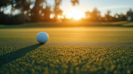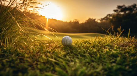 Close up view of golf ball resting on grassy surface, illuminated by warm sunset light in background. scene evokes sense of tranquility and focus, perfect for golf enthusiasts