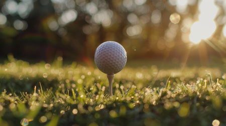 The dawn light reflects off a golf ball on a tee, setting a peaceful scene for a game on the fresh green course