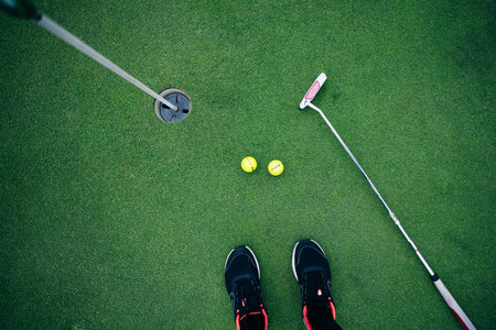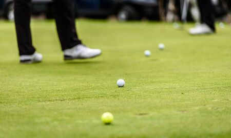 Golfer legs at golf tournament practice swing with golf club. Golf players on green lawn putting golf ball in the hole. Golfing competition or tournament.