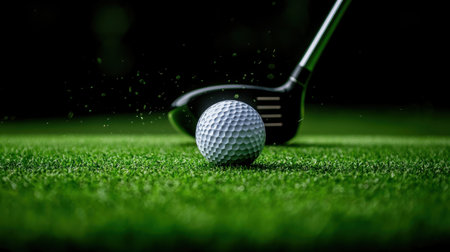 A close-up view of a golf club and a pristine white golf ball resting on vibrant green turf under bright lighting, perfect for sports enthusiasts.