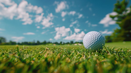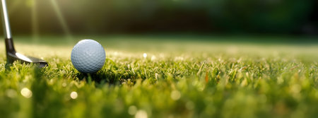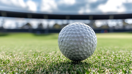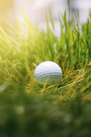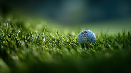 A close-up shot of a golf ball resting on lush green grass, captured in natural light. The image showcases the textures and soft shadows, evoking the thrill of outdoor sports.