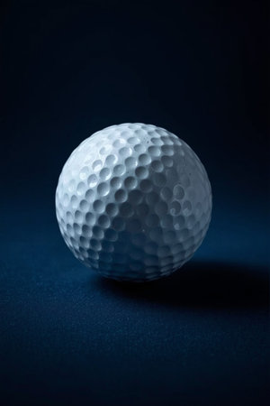 A detailed view of a white golf ball with visible dimples, lit from the top left and casting a shadow. The dark background enhances the texture and spherical shape, ideal for sports or product imagery.