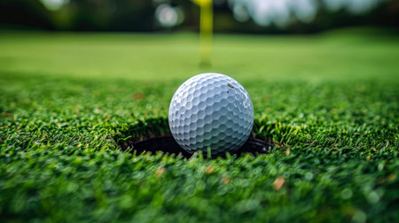 Close-up of a golf ball resting right on the edge of the hole, captured with perfect focus on the green grass texture.
