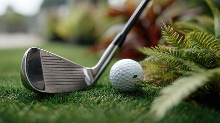 A stunning close-up view of a golf club and ball resting on vibrant green grass, surrounded by delicate ferns and bright foliage, showcasing a serene sports setting.
