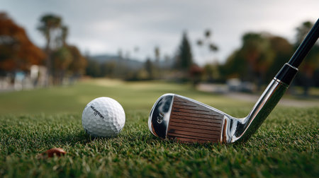 A close-up view of a golf ball resting on grass, complemented by a golf club in the background, showcasing a serene autumn setting.