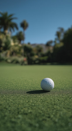 Golf ball on green putting surface bathed in sunlight with blurred palm trees and sky
