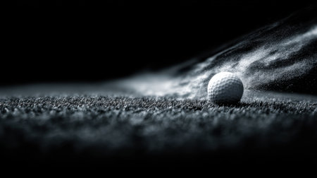A stunning black and white close-up of a golf ball resting on textured grass, enhanced by a dust effect in the background, illustrating the beauty of sports action.