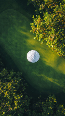 A close-up view of a golf ball resting on a verdant green, illuminated by the warm rays of the morning sun, creating a tranquil sports scene.