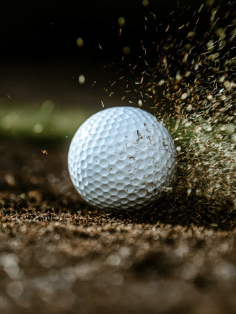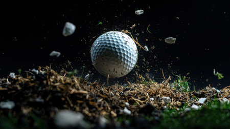 A golf ball is in the air, surrounded by debris and dirt. Concept of chaos and destruction, as if the golf ball has caused a mess or disturbance in its wake