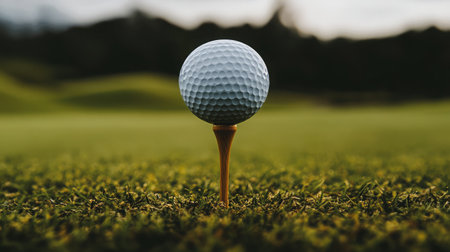 A close-up view of a golf ball on a tee, set against a lush green landscape. Perfect for showcasing sports, leisure activities, and outdoor enjoyment.