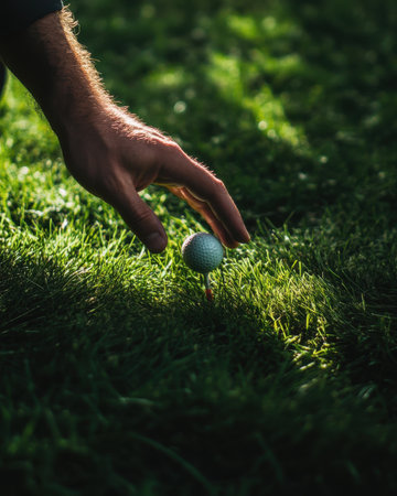 A hand delicately positions a golf ball atop a tee nestled in lush green grass. Soft sunlight casts gentle shadows, enhancing the tranquil afternoon atmosphere.