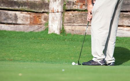 Golfer puts on green for birdie on vacation. Golfer feet on green hitting hole