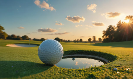 A stunning close-up image of a golf ball poised on the edge of a hole on a green, with warm, soft lighting highlighting the morning atmosphere.