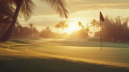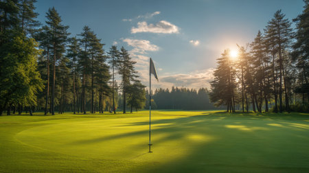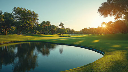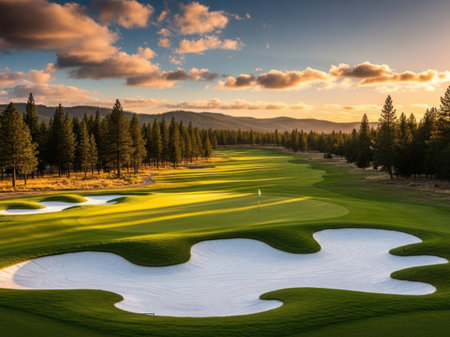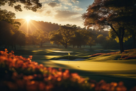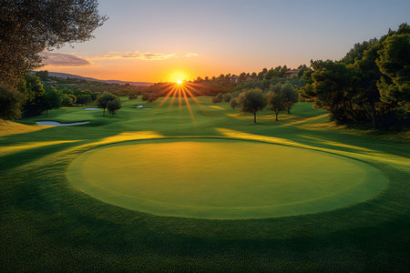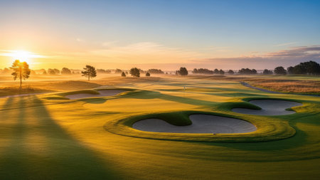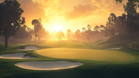 A stunning golf course bathed in the warm glow of sunrise, featuring lush greens and a serene atmosphere. Perfect for nature lovers and golf enthusiasts.
