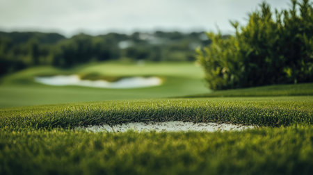 A golf course framed in a minimalist style, with a blurred sand trap background, capturing the challenge of the game