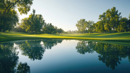 A golf course with a crystal-clear pond, blurred trees in the background, reflecting the calm and peaceful surroundings