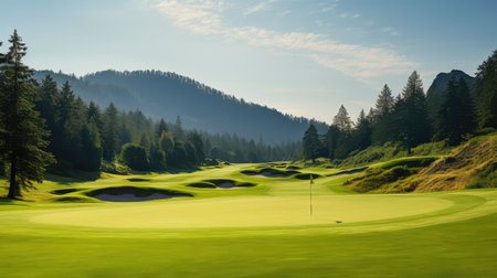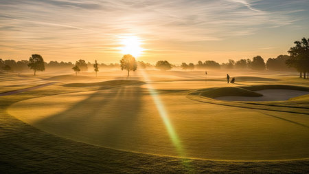 Captivating image of a morning golf course featuring dew-kissed grass and soft sunlight illuminating the serene landscape, perfect for golf enthusiasts and nature lovers.
