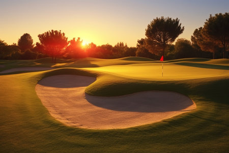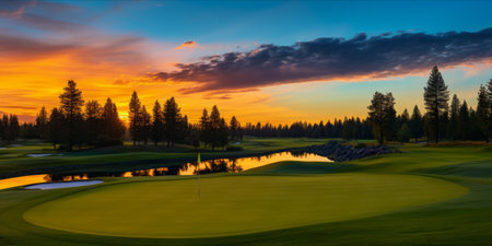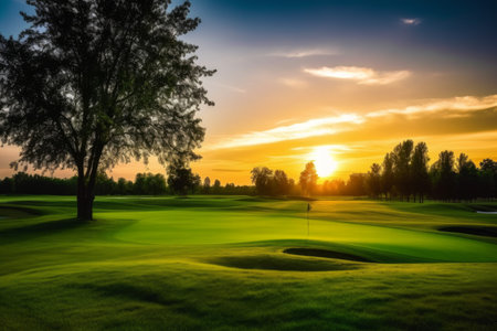 A tranquil golf course scene at sunset, featuring manicured greens, surrounding trees, and a glowing sky. the peaceful setting highlights the beauty of nature and the sport, perfect for leisure and outdoor recreation themes. Generative AI