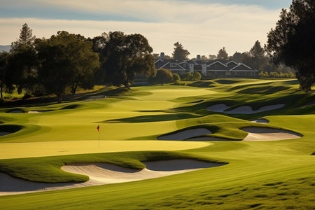 Luxury country club golf course, with manicured fairways and pristine greens. Beautiful place for playing golf outdoor. Generative AI