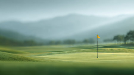 This tranquil golf course scene features a yellow flag atop a lush green area, surrounded by soft mountains and serene landscape, perfect for relaxation and recreation.
