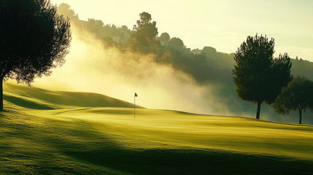 A serene morning fog envelops a beautiful golf course, showcasing vibrant greenery and tranquil trees. Perfect for nature lovers and outdoor enthusiasts.
