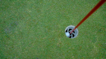 Close up of golf hole, golf flag and green grass