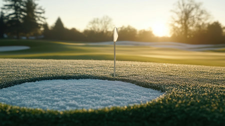 Experience the serene beauty of a frosty golf green bathed in the warm glow of sunrise. This captivating scene invites you to enjoy the tranquility of nature and outdoor leisure.