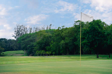 Golf ball is on a green lawn in a beautiful golf course with morning sunshine. Ready for golf in the first shot.