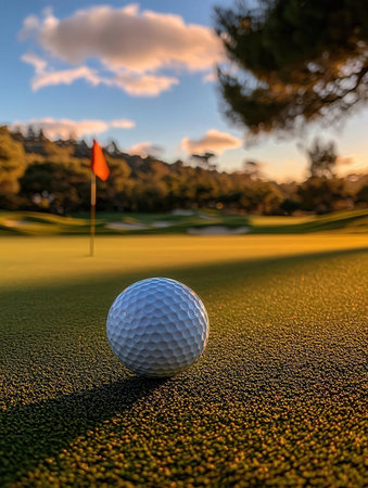 Golf ball on the green of a beautiful golf course at sunset