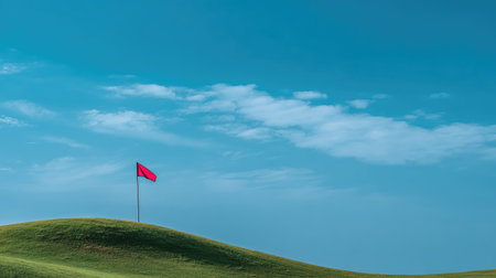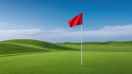A serene image depicting a red flag standing tall on a lush green golf course, framed by rolling hills under a bright blue sky, ideal for outdoor sports themes.