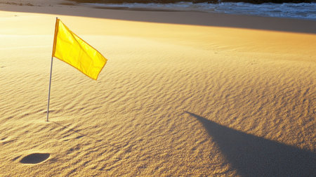 A lone yellow flag stands prominently on a sandy beach during sunset, casting long shadows on the smooth surface while gentle waves lap in the background.