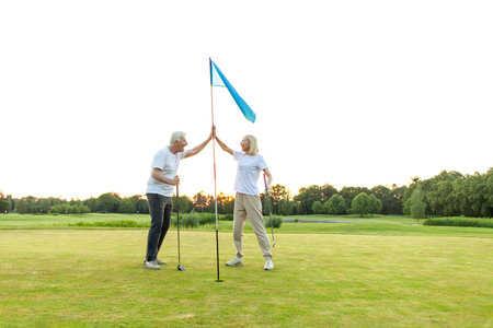 elderly senior couple in uniform celebrating victory and success in golf game and giving high five, old man and woman playing golf on golf course at sunset and doing outdoor sports