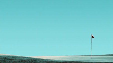 A beautiful landscape of a golf course featuring a flag on a green hill against a tranquil teal sky. Ideal for themes of leisure, sports, and outdoor relaxation.