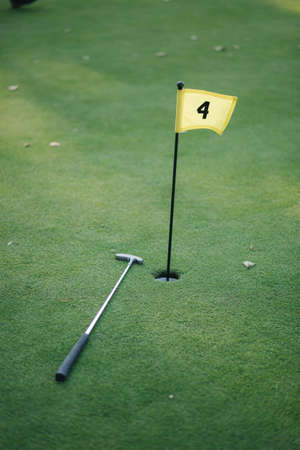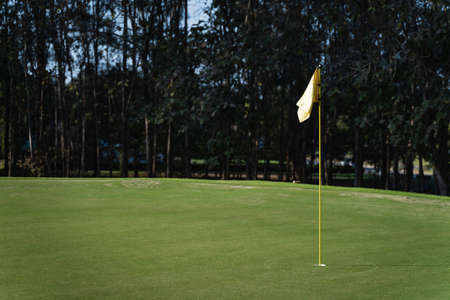 yellow golf flag in hole on green