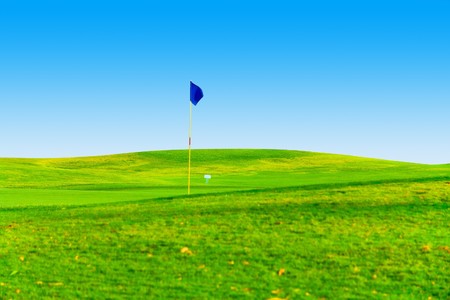 Golf course landscape with flag on green hill and clear blue sky