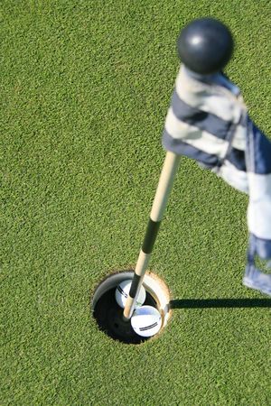 Close up of a golf course flag and two golf balls.