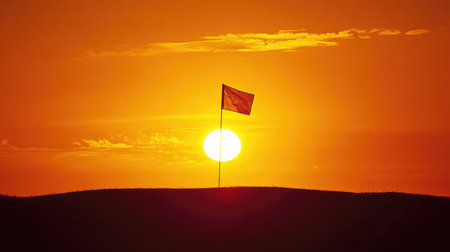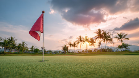 Captivating close-up of a red golf flag marking a hole on the green, set against a serene sunset backdrop with a lush landscape in the distance. Perfect for sports enthusiasts.