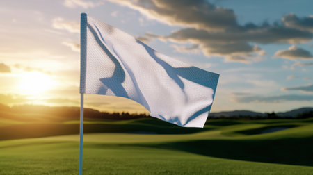 A peaceful golf course scene showcasing a white flag in a hole, surrounded by lush green grass in soft evening light, perfect for leisure and outdoor activities.