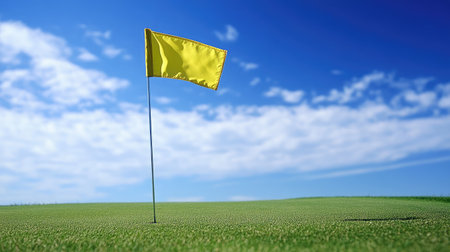 A captivating golf course scene featuring a bright yellow flag marking a hole. The lush green grass and warm sunset create a perfect backdrop for outdoor enjoyment.