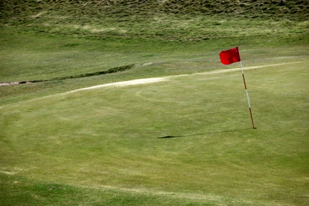 Beautiful golf course in summer with red golf flag and green grass