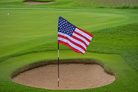 A US flag stands proudly in the hole of a golf course surrounded by lush green grass and sand.