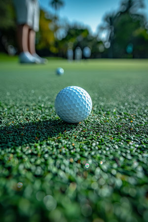 A golf ball rests on a manicured green, with a golfer positioned in the soft-focus background. The shot captures the texture of the grass and the morning sunlight. The composition may be suitable for promotional materials related to sports, leisure activities, or outdoor events.
