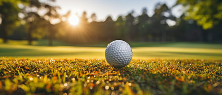 Golf ball on a lush green grass with morning dew under the golden glow of sunrise, set on a scenic golf course.