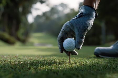 A close-up view of a hand in a golf glove carefully placing a golf ball on a tee as the sun sets over a scenic landscape. The tranquility of the moment captures the essence of the sport.