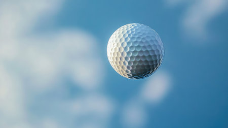 A golf ball in mid-air against a blue sky, captured at the moment of impact, showcasing motion and precision