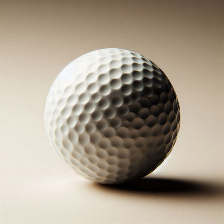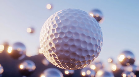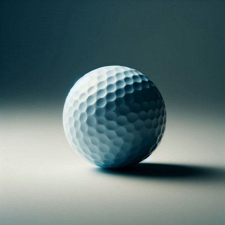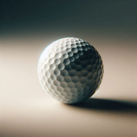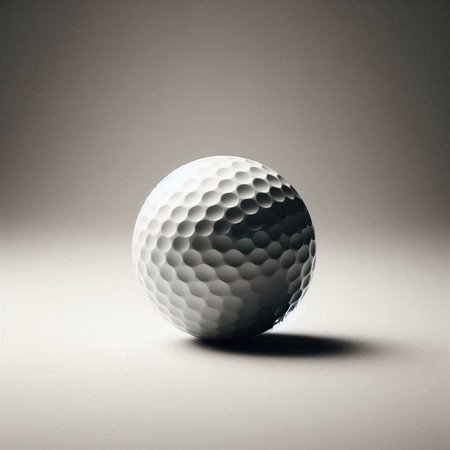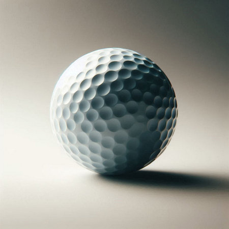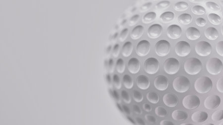 3D rendering of a golf ball with a white background, highlighting its dimples and smooth texture in a clean and minimalist composition.