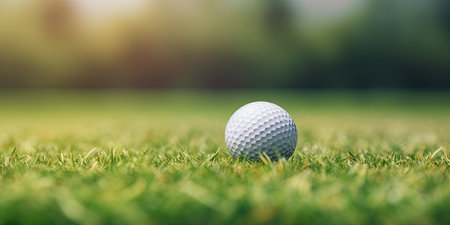 An engaging close-up image of a golf ball resting in vibrant green grass with a golf club nearby, capturing the essence of outdoor sports in a natural setting.